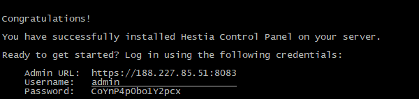 Процесс установки, как правило, занимает около 15-20 минут, по его завершению вы увидите автоматически сгенерированные данные для доступа в панель. Запомните их;